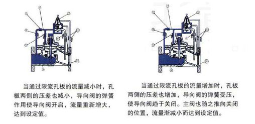 當通過限流孔板的流量減小時,孔板兩側(cè)的壓差也減小,導向閥的彈簧作用使用導向閥開啟,流量重新增大,達到設定值。當通過限流孔板的流量增加時,孔板兩側(cè)的壓差也增加,導向閥的彈簧受壓,使用導向閥趨于關(guān)閉。主閥也隨之推向關(guān)閉的位置,流量漸減小而達到設定值。